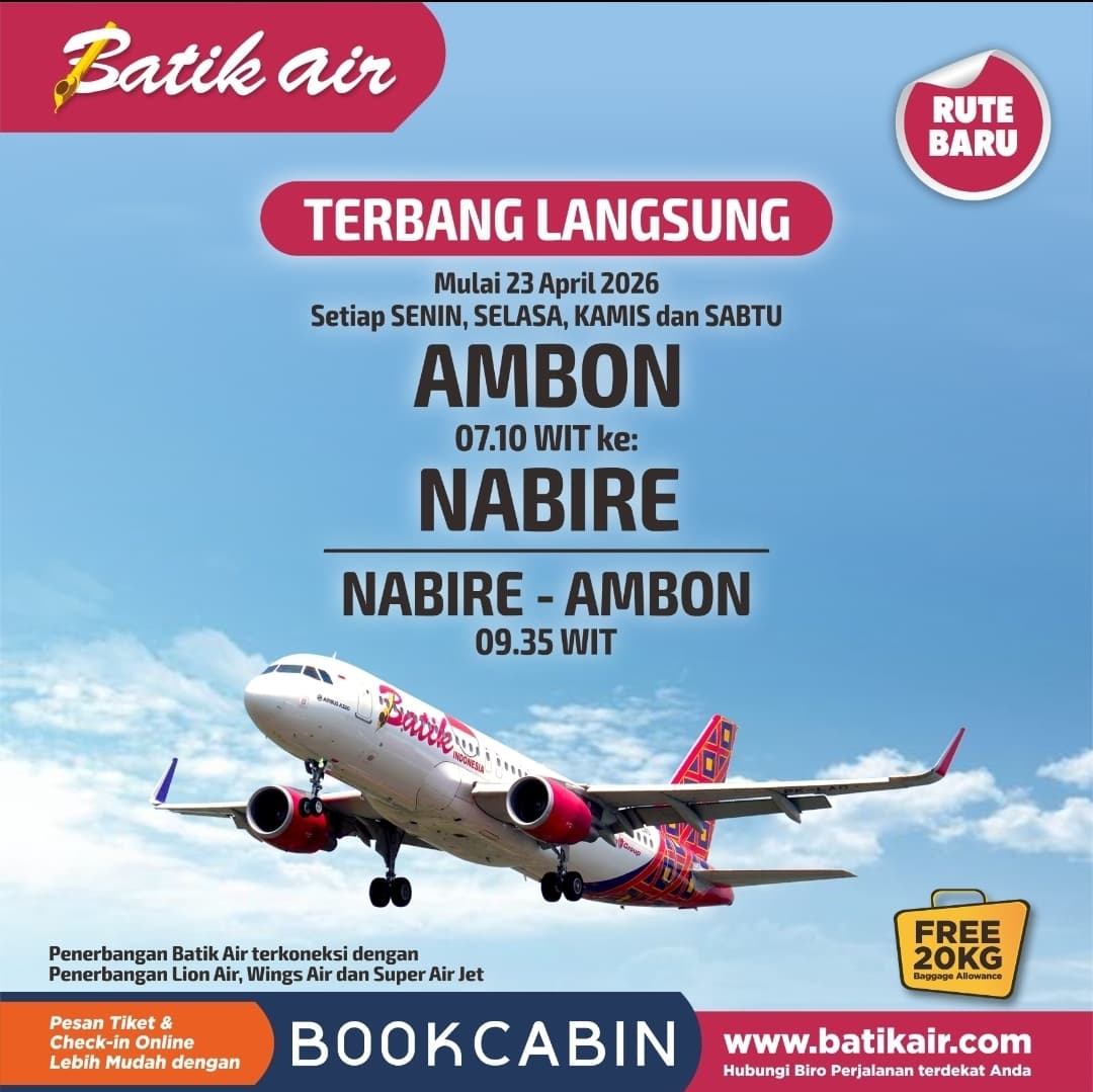 AMBON,PMN,CON : Ambon–Nabire Tanpa Transit, Batik Air Mulai Operasi April  Angkasa Pura Indonesia Cabang Bandar Udara Internasional Pattimura Ambon resmi mengumumkan pembukaan rute penerbangan langsung Ambon (AMQ) – Nabire (NBX) tanpa transit yang akan mulai beroperasi pada 23 April 2026. Layanan ini dijalankan oleh maskapai Batik Air sebagai bagian dari Lion Group.