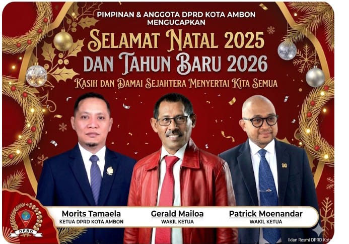 Iklan Natal 2025 & Tahun Baru 2026 AdrianusDesember 20, 2025Maret 30, 202624 Dilihat Post Views: 24 Pos terkaitMusda II Kusgoro 1957 Maluku Jadi Momentum Konsolidasi OrganisasiPerkuat Keamanan Maritim, Dankodaeral IX Hadiri Peresmian Gedung Zona Bakamla TimurKunker ke Ambon, Kapok Sahli Dankodaeral IX Sambut Kedatangan Wakil Ketua Komisi I DPR RIDies Natalis ke-64 GAMKI Kota Ambon Jadi Momentum Penguatan Iman dan Kepedulian SosialWabub Bursel Dorong PLN Alihkan Jaringan Listrik Demi Stabilitas PasokanFarid Husein Beri Atensi, Seleksi Sekkot Ambon Harus Objektif dan Transparan