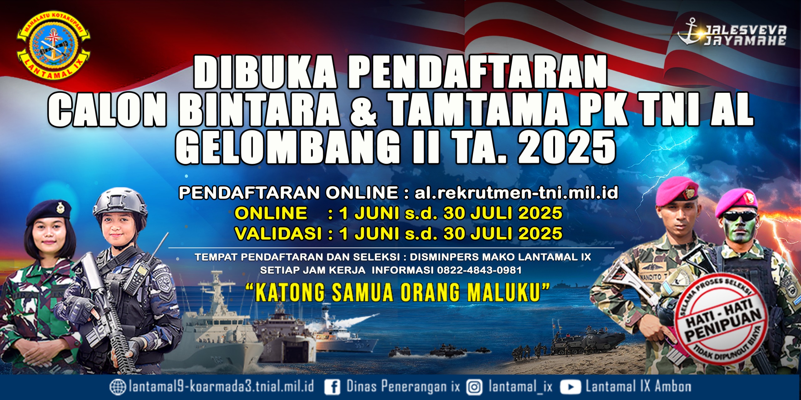 AMBON, PG. COM : Panitia Daerah (Panda) Lantamal IX Ambon secara resmi membuka kembali penerimaan calon Bintara dan Tamtama PK TNI Angkatan Laut tahun 2025. Senin (02/06/2025)