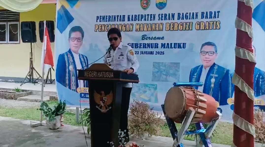 SBB,PM.COM : Penjabat Gubernur Maluku Sadali Ie melaunching program makan bergizi gratis (MBG) yang dilaksanakan Pemerintah Kabupaten Seram Bagain Barat (SBB) ditandai dengan pemukulan tifa, bertempat di Negeri Hatusua, Kecamatan Kairatu pada Rabu (22/1/2025).